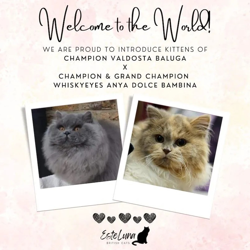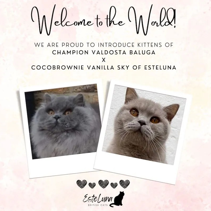 Our BLH babies were born on 30 July 2023 and are doing extremely well. We have four boys and two girls, and oh my aren’t they just adorable! These kittens are an amazing mix of old and established UK lines and imported, European lines, which shows. Baluga and Anya did well! Both parents have fantastic temperaments and are total lap cats, so we expect these little ones to grow into complete love bugs also.
