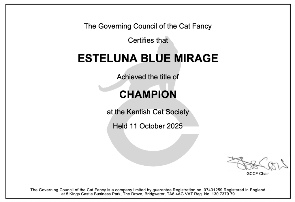 - EsteLuna Blue Mirage – Challenge Certificate (making her a Champion!)