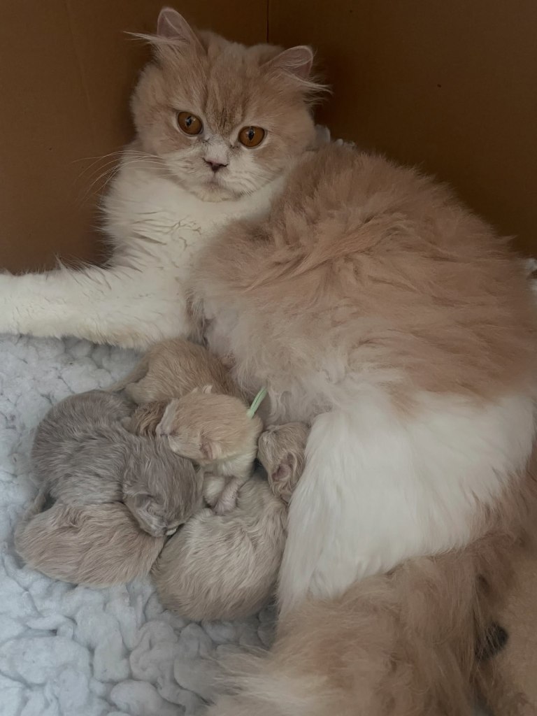 We have three boys (cream and cream/white) and one girl (lilac tortie). They are all British Longhair.